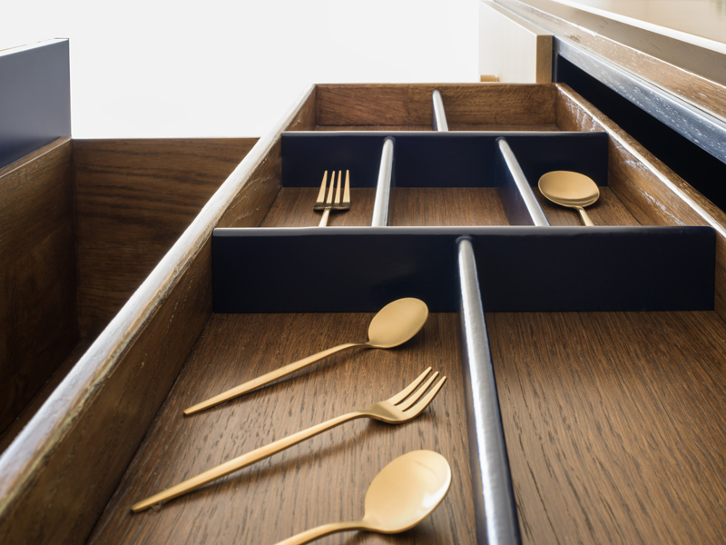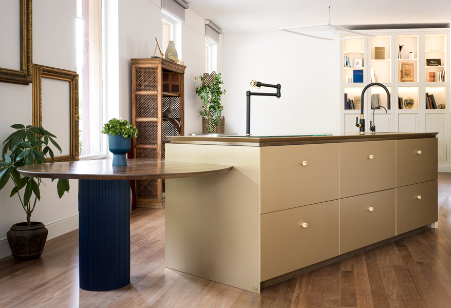 La nostra isola è molto più di una semplice cucina; è uno spazio vivace e accogliente. La verniciatura in polvere d’oro conferisce un’eleganza senza tempo, mentre il legno di rovere aggiunge calore e naturalezza. I dettagli blu, che emergono con raffinatezza, e le fresature nette a 45° creano un perfetto equilibrio tra classicità e modernità. Ogni elemento si fonde armoniosamente, trasformando questa cucina in un capolavoro di design che invita a vivere momenti conviviali.